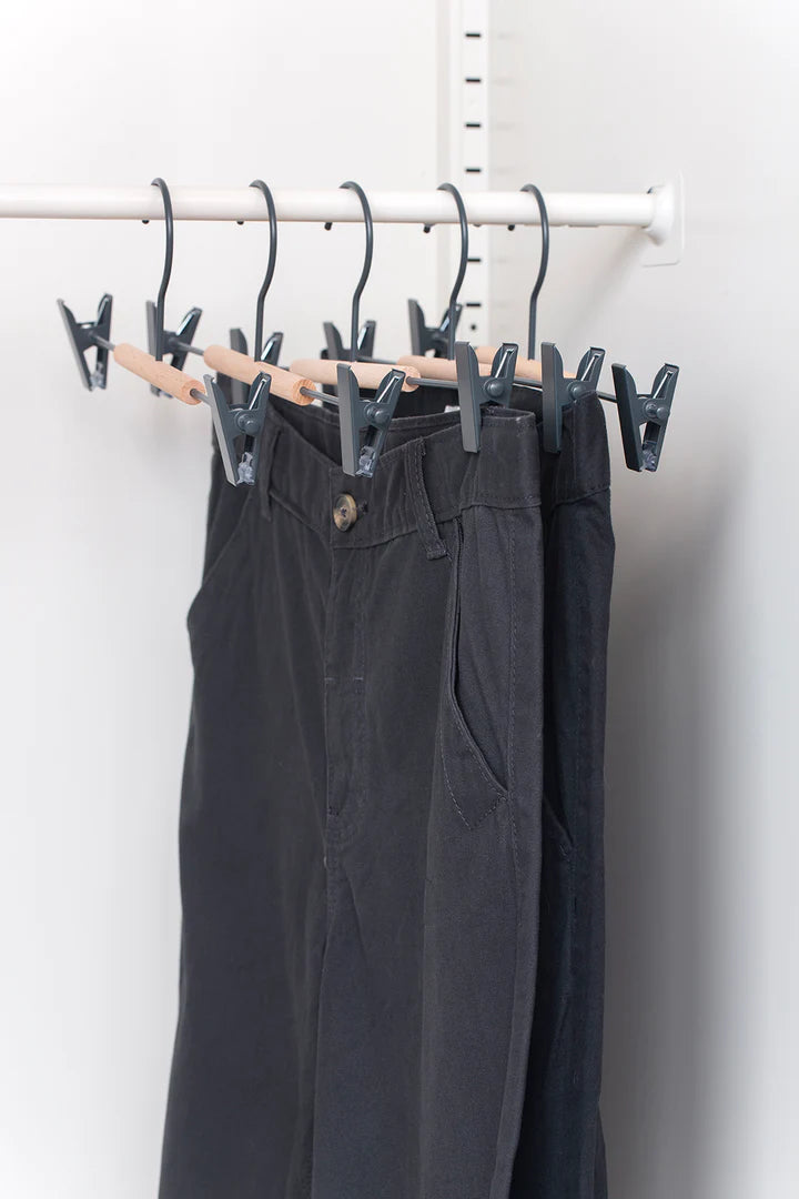 Our fancy clip hangers have a smooth matte powder-coated finish, a wooden detail and two clippy clips ready to hold your clothes just right.