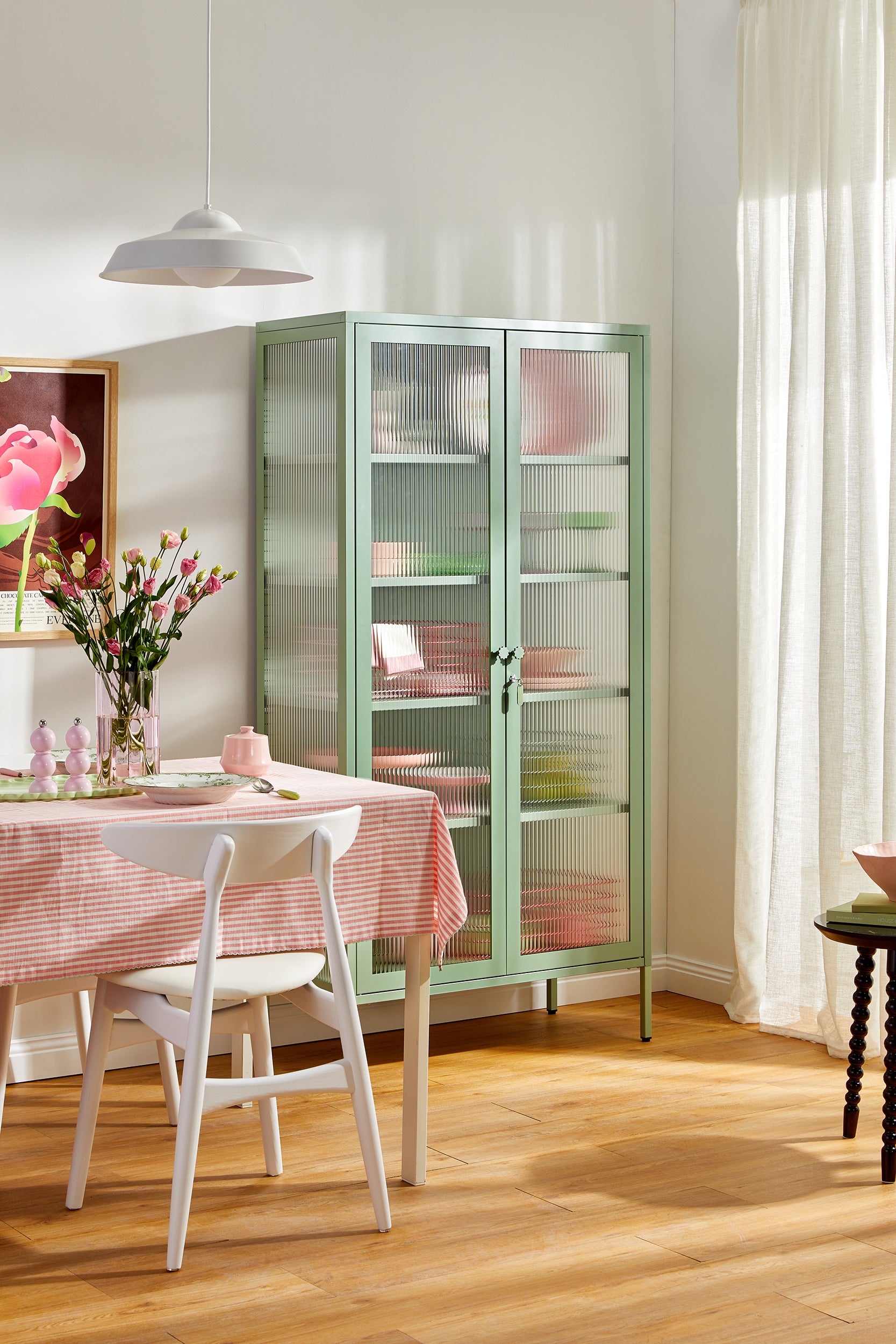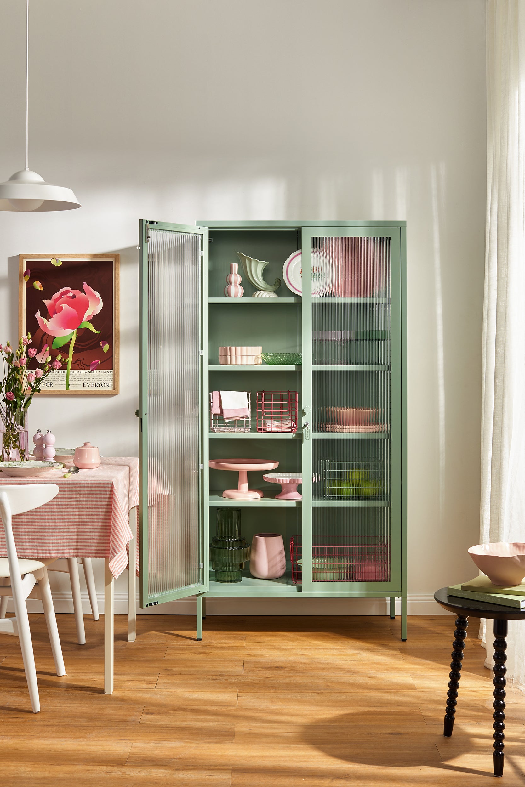 Fluted glass keeps your keepsakes safe, so you can protect your treasures while letting them shine. Pick your pop of colour, we'll bring the details: medallion handles, a custom enamel keyring and adjustable feet present your precious pieces in style.