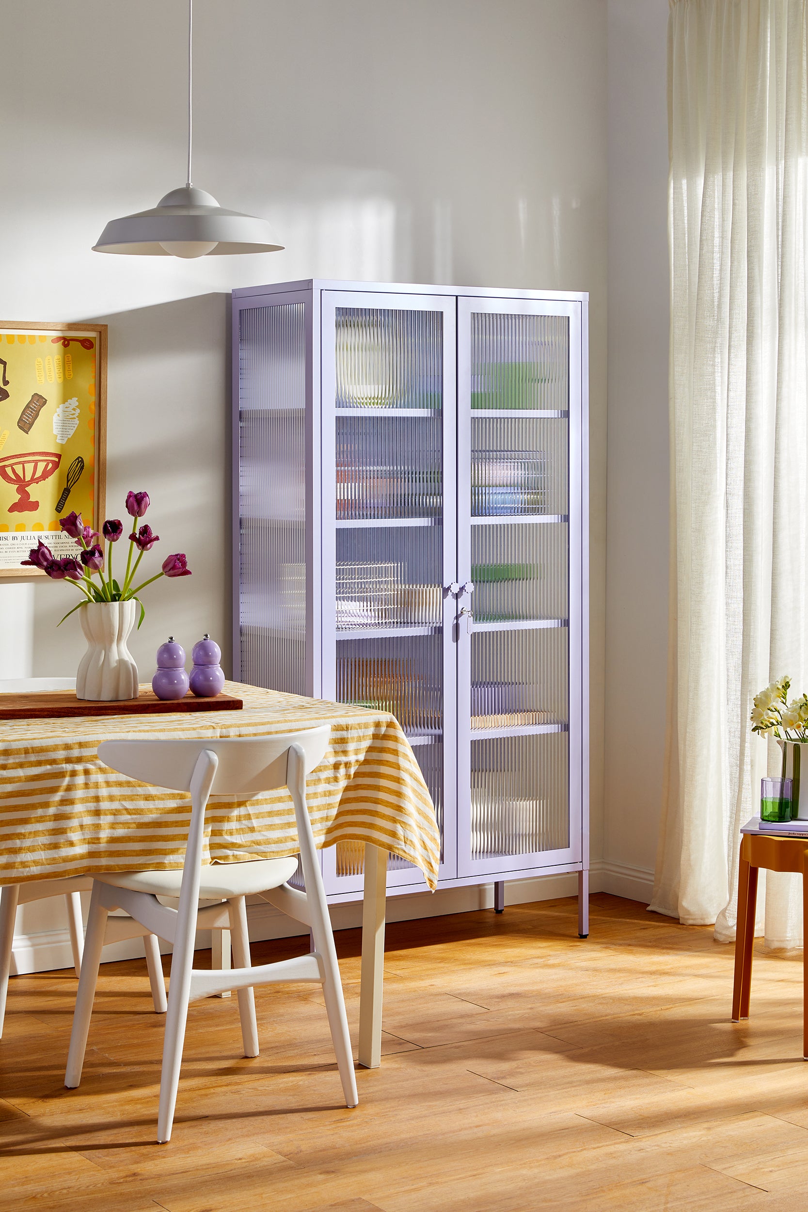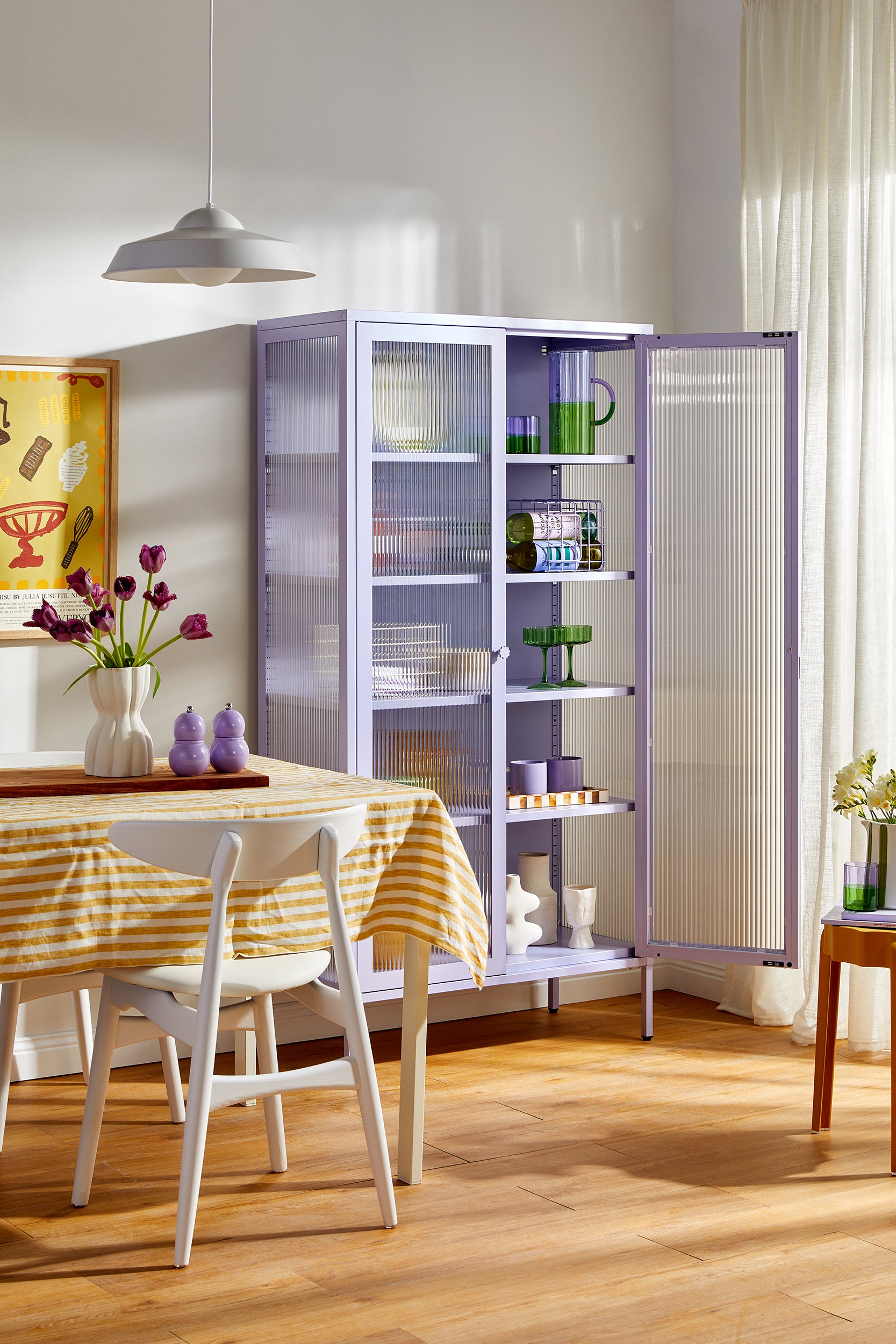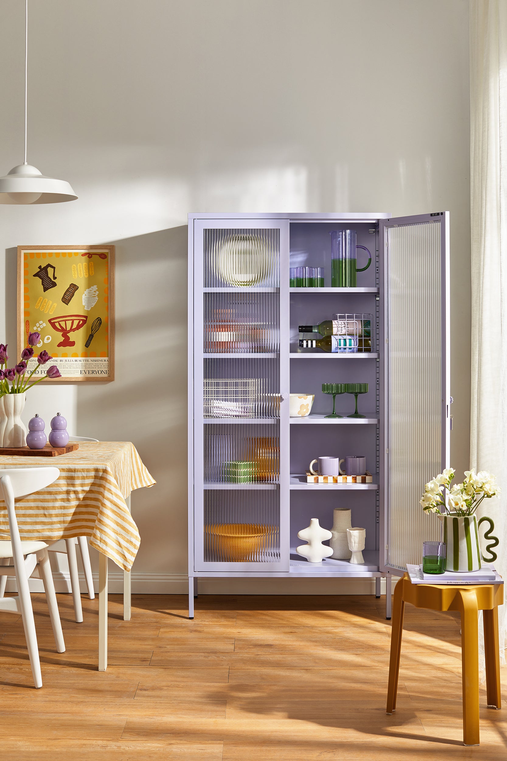 Fluted glass keeps your keepsakes safe, so you can protect your treasures while letting them shine. Pick your pop of colour, we'll bring the details: medallion handles, a custom enamel keyring and adjustable feet present your precious pieces in style.