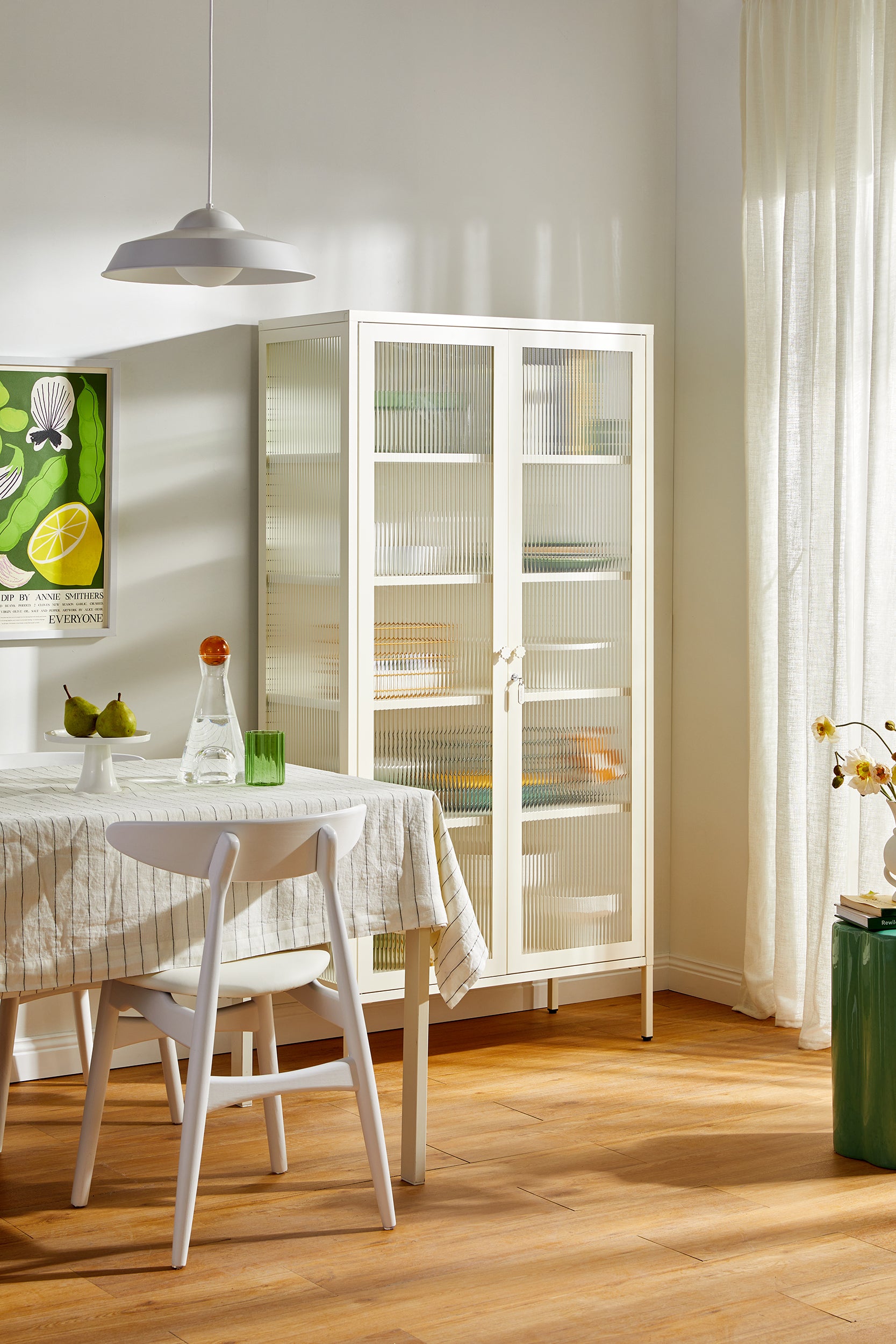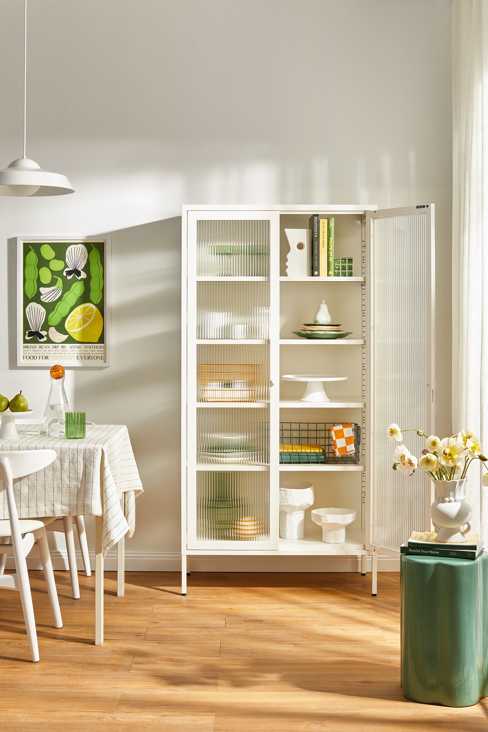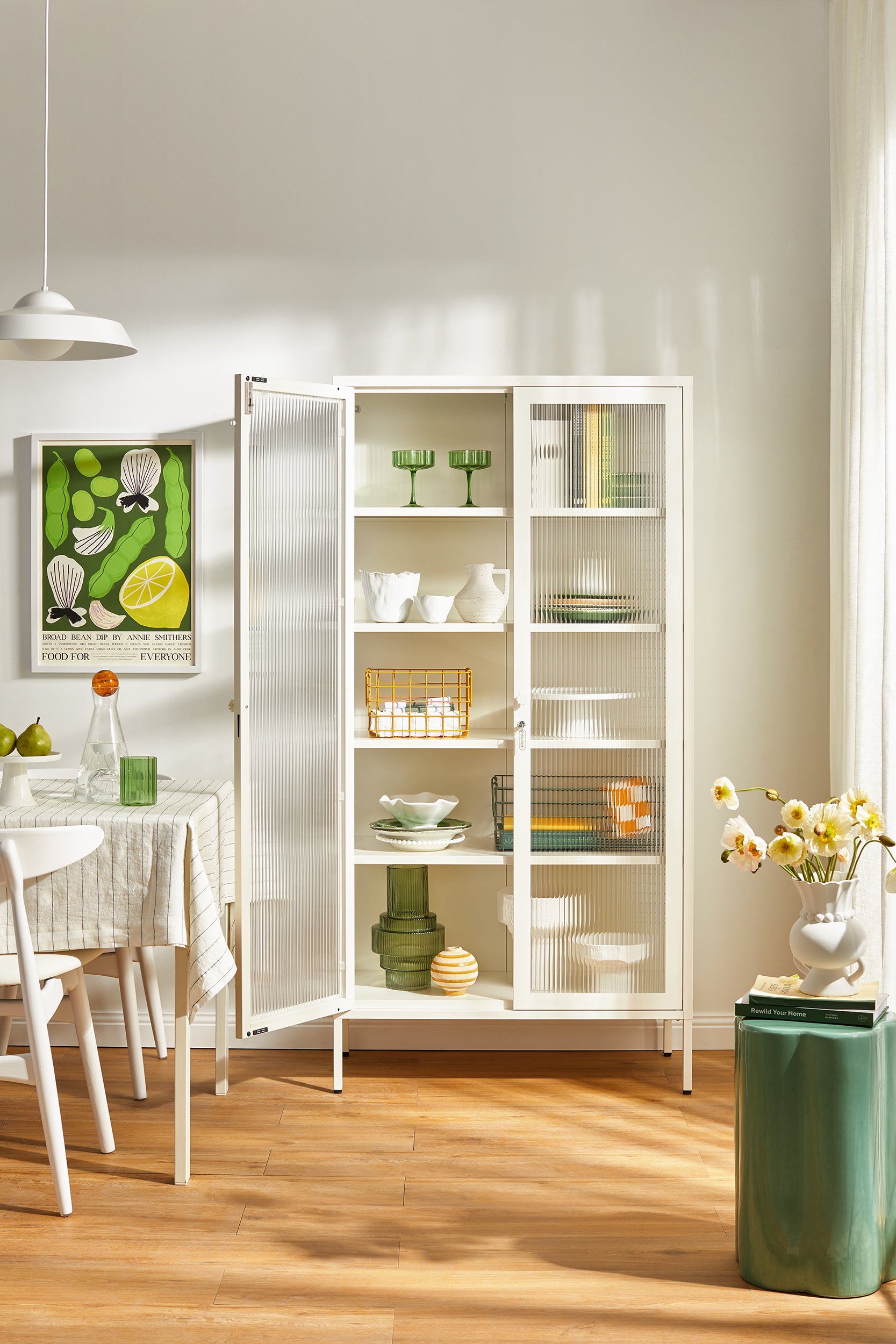 Fluted glass keeps your keepsakes safe, so you can protect your treasures while letting them shine. Pick your pop of colour, we'll bring the details: medallion handles, a custom enamel keyring and adjustable feet present your precious pieces in style.
