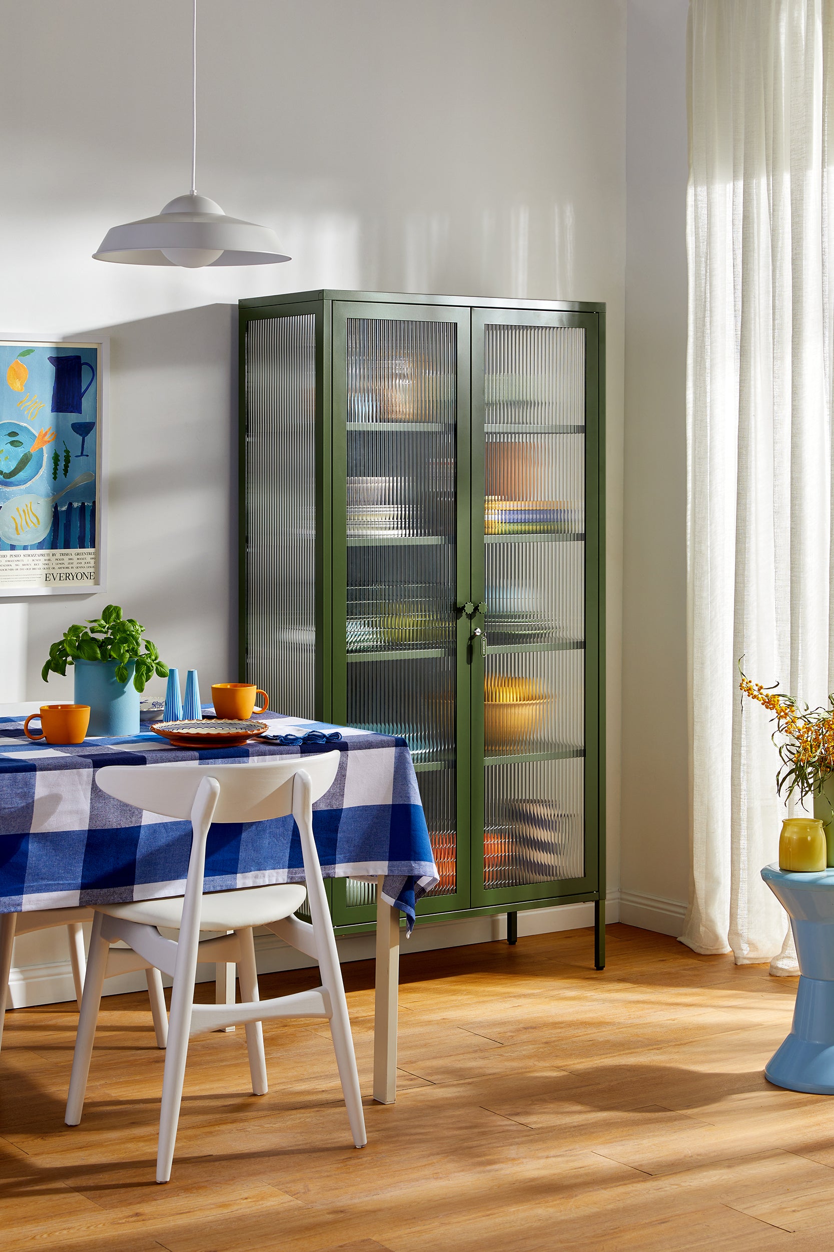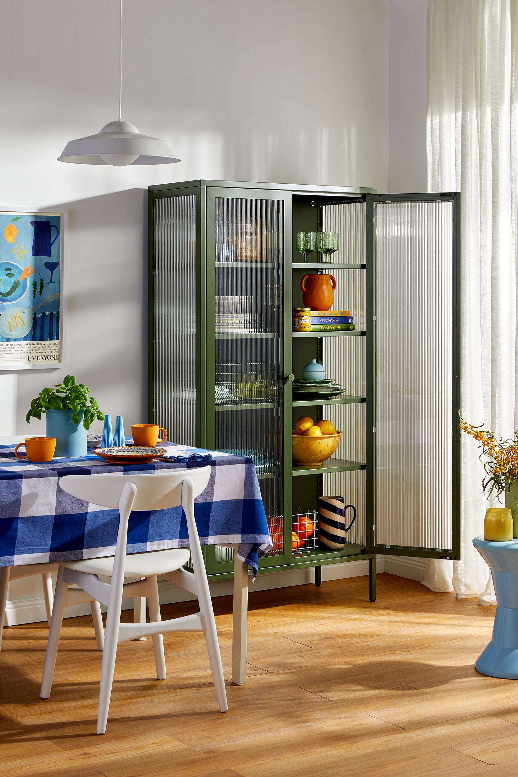 Fluted glass keeps your keepsakes safe, so you can protect your treasures while letting them shine. Pick your pop of colour, we'll bring the details: medallion handles, a custom enamel keyring and adjustable feet present your precious pieces in style.