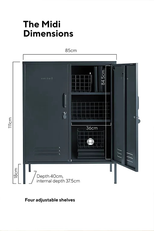 The Midi locker has maximum storage potential and she loves to be artfully styled on top to look her best. Use her as a toy cupboard, in the kitchen or hiding all the shoes and bags in the hallway. How does The Midi compare? It’s the same width as The Twinny and taller than the Lowdown, it’s a perfect mid height (that’s why we called her the Midi!)