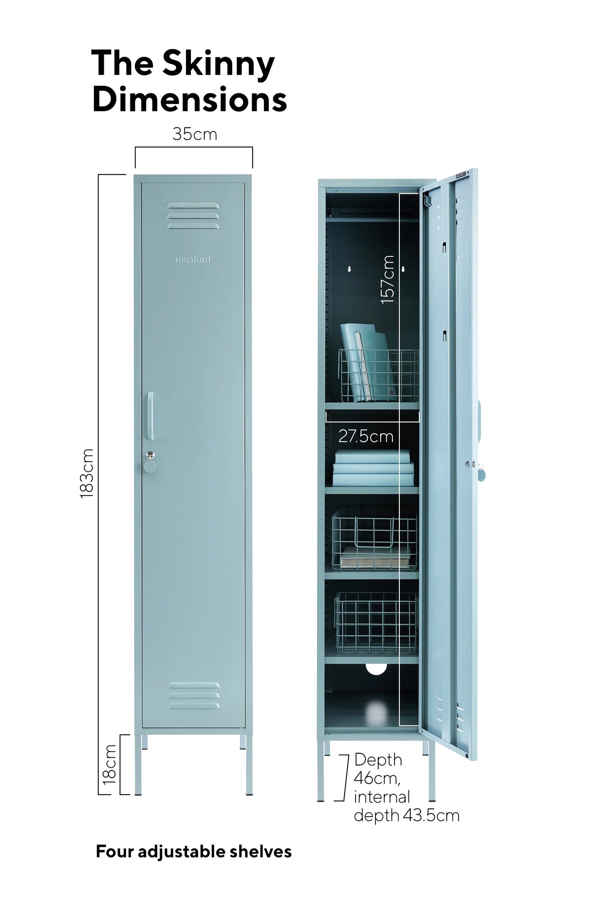 The Skinny locker wants to help. She'll keep your stuff neat and tidy and you’ll be amazed how much you can fit inside. Standing alone or paired with friends, The Skinny is pretty, practical and cool.