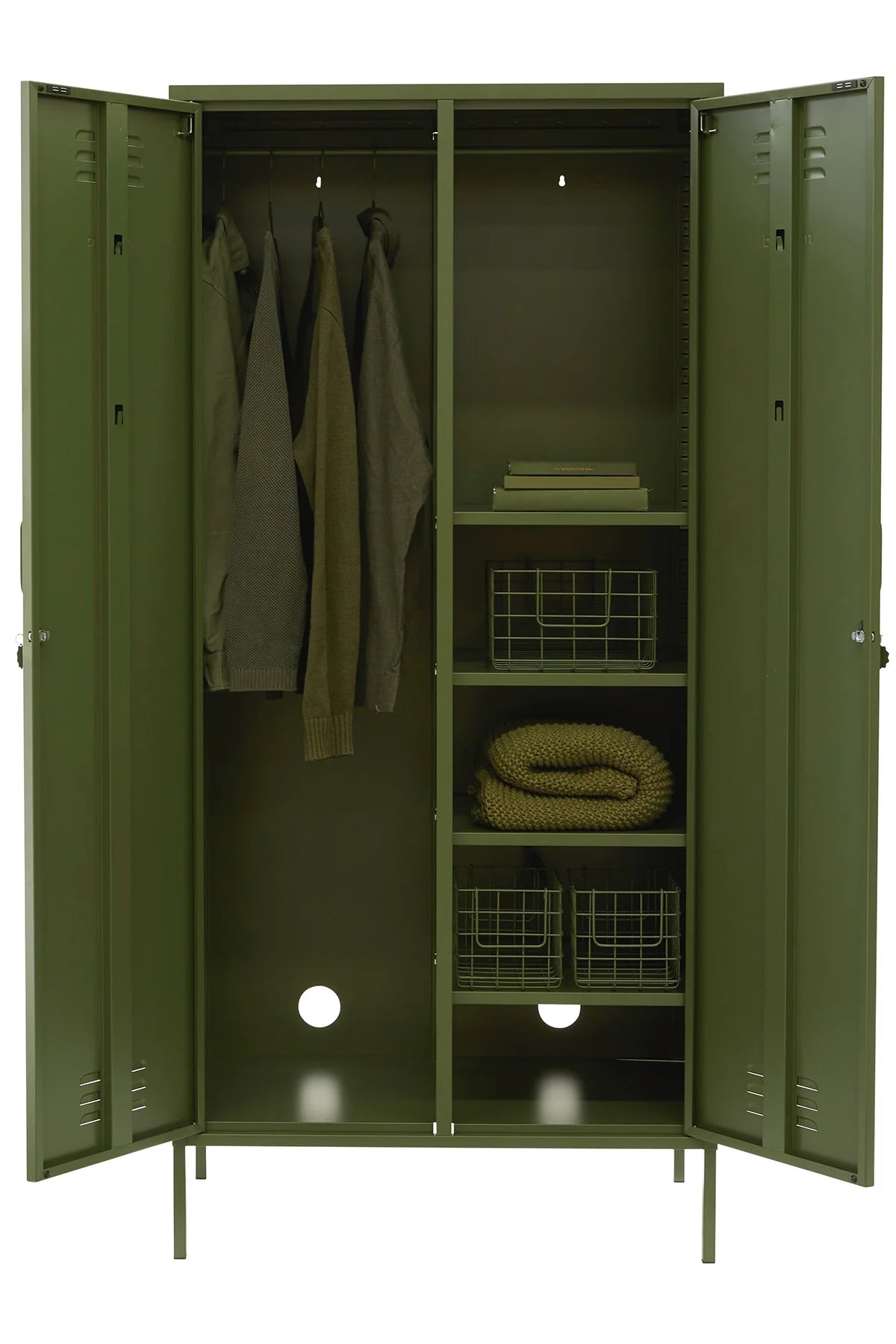 Inside: Four adjustable shelves, four handy hooks (two on the inside of each door), two hanging rails (can be removed), two cable holes, wall attachment points.