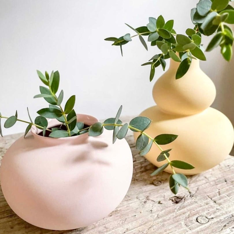 Vase in soft pastel blush pink ,porcelain. Miniature circular shaped in matte finish, with a glazed interior.